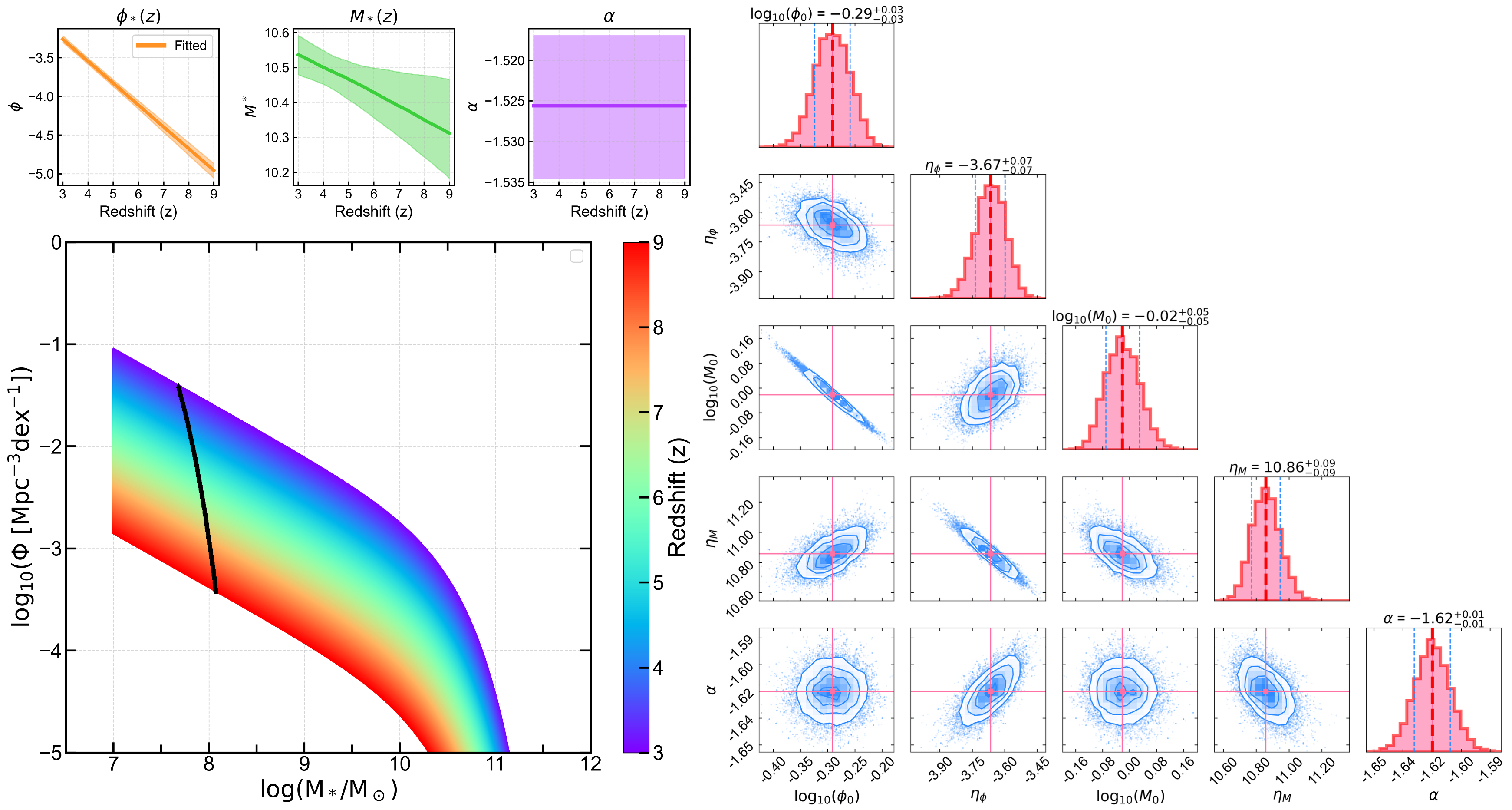 This is an intersting ongoing project! We are developing a forward-modeling bayesian method to fit galaxy stellar mass functions using all galaxies at once, incorporating their full redshift and stellar mass posteriors — all without any binning in redshift or stellar mass. This allows us to trace Evolving Stellar Mass Functions with unprecedented continuity and precision. More interestingly, the Schechter function parameters — \(\Phi^*\), \(M^*\), and \(\alpha\) — are now modeled as smooth functions of redshift: \(\mathbf{\Phi^*(z)}\), \(\mathbf{M^*(z)}\), and \(\mathbf{\alpha(z)}\). This means that parameter values across different epochs are no longer independent, but correlated through cosmic time!
